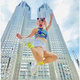 横断幕が掲げられた都庁をバックにこちらを向いてジャンプしているもの